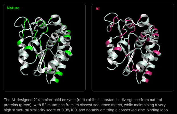 310.ai’s MP4 platform designed a novel enzyme optimized for ATP regeneration. Unlike natural adenylate kinases, this protein, while ~70% similar to natural adenylate kinases, features AI-designed structural enhancements that boost stability, binding, and catalysis beyond evolutionary constraints.