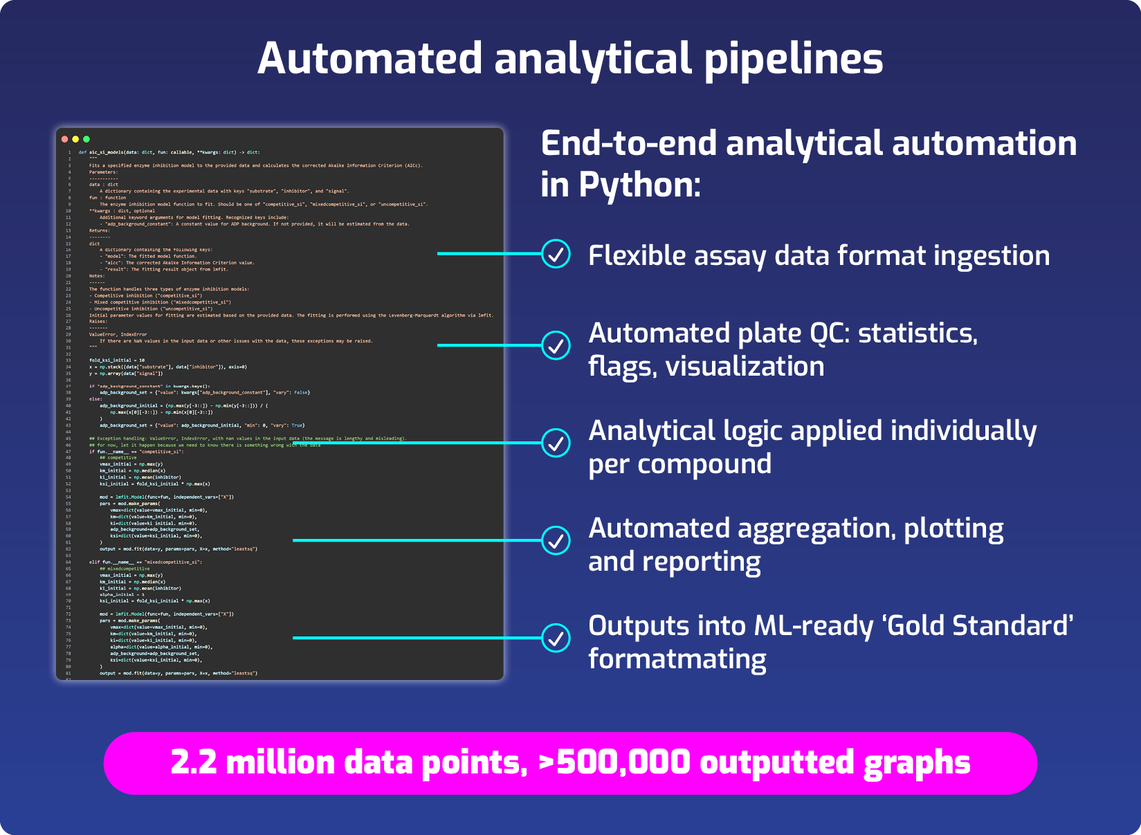 Advancing generative chemistry, target prediction and bioactivity modelling demands training sets that are vast, clean and mechanistically rich. Ulysses executes millions of fully annotated biochemical, cellular, biophysical and structural experiments under robotic control, delivering reproducible, multi-modal datasets ready for immediate ingestion by your foundation models and active-learning loops.